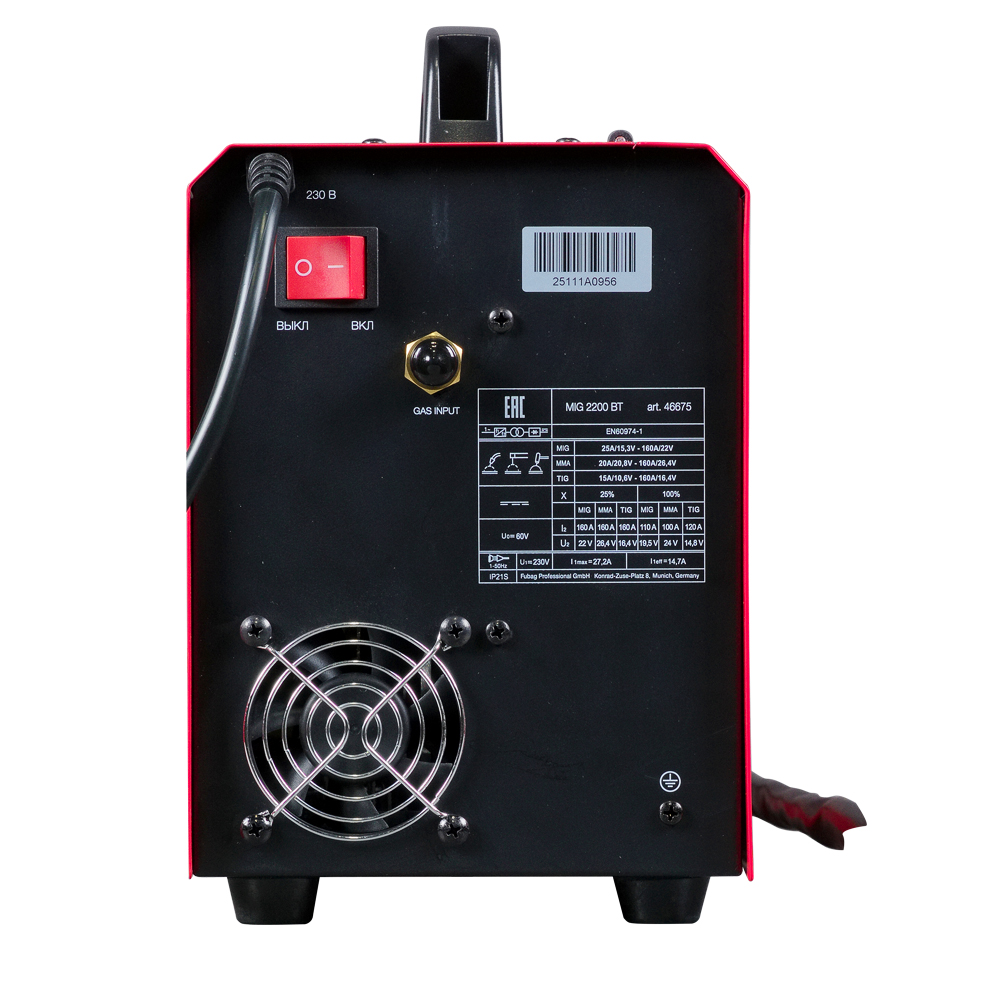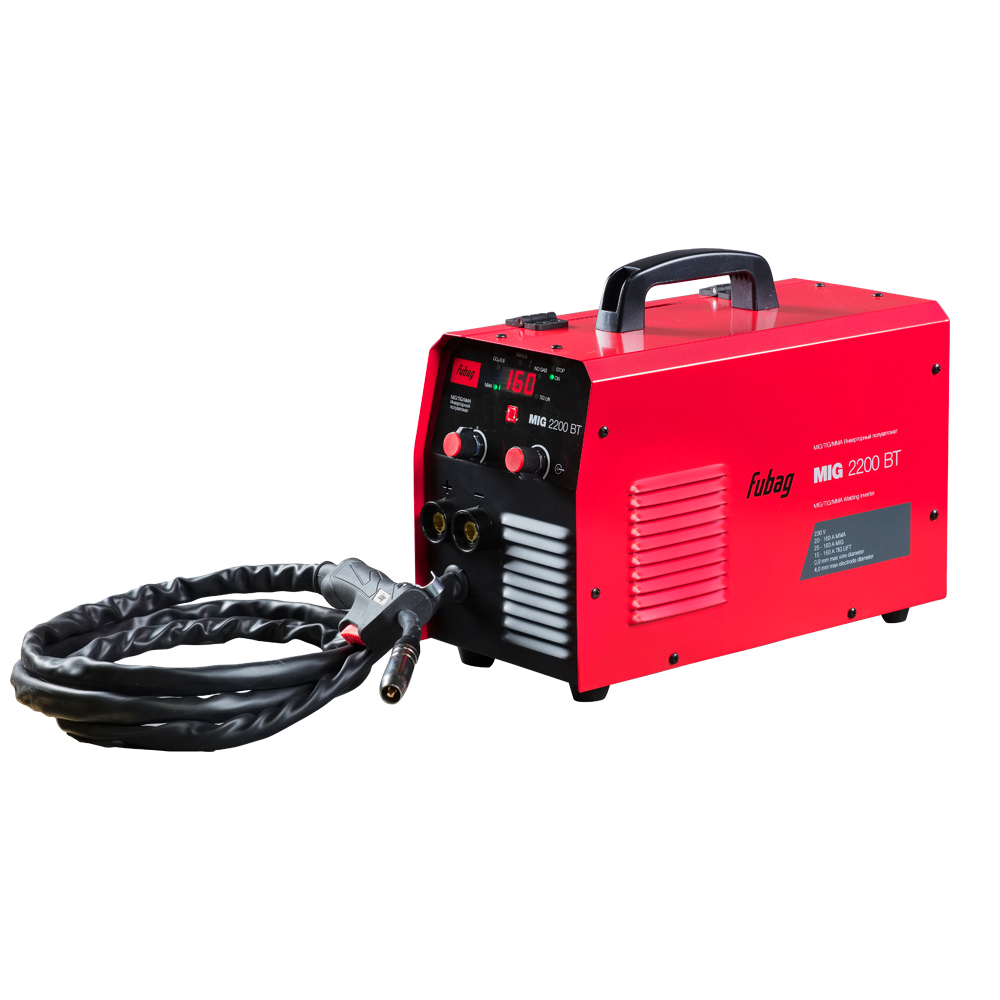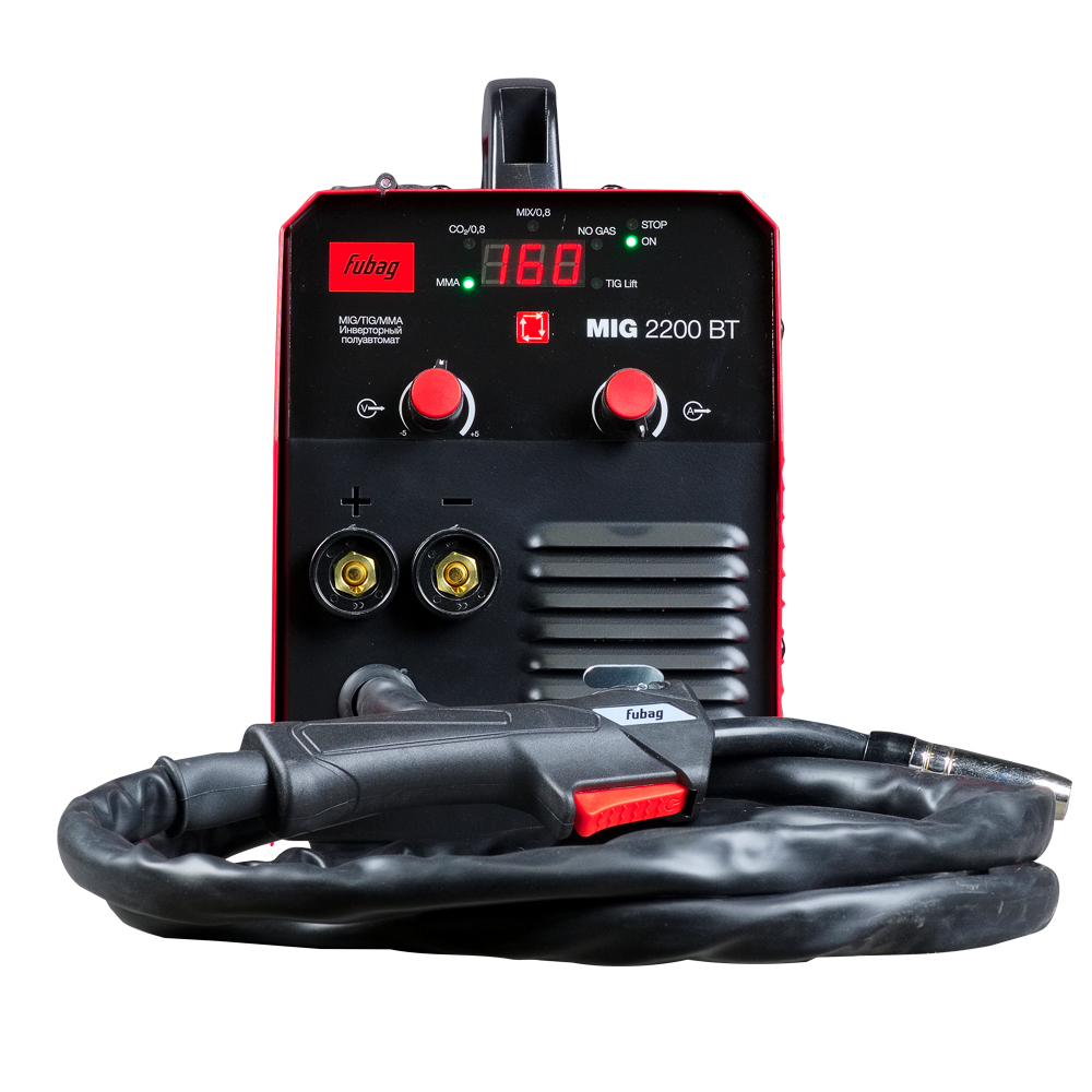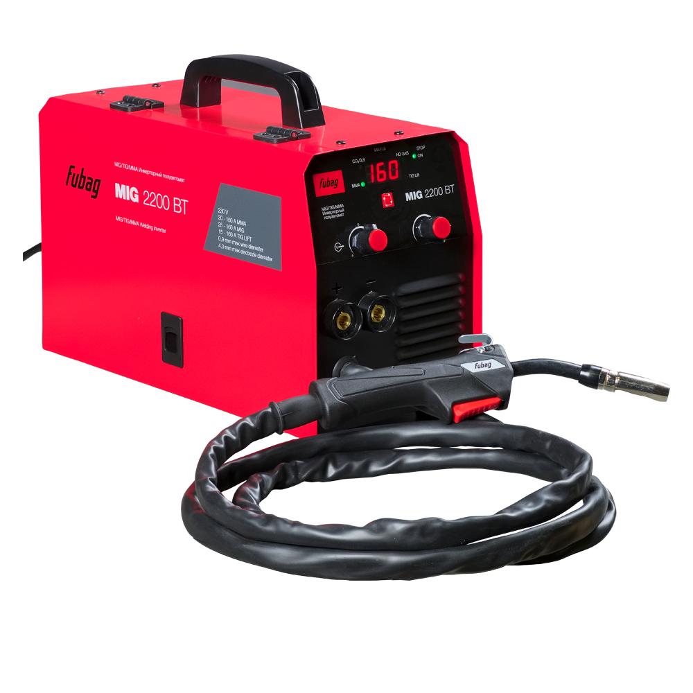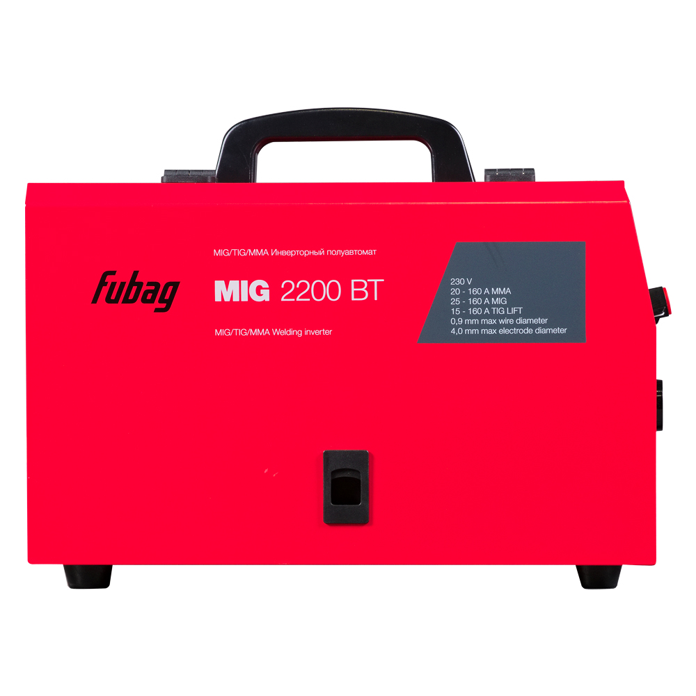 Сварочный инвертор Fubag MIG 2200 BT – высокопроизводительный сварочный полуавтомат 4 в 1, оптимален для проведения широкого спектра сварочных работ в режиме полуавтоматической, ручной дуговой и TIG LIFT сварки. Аппарат позволяет проводить сварку в режимах MIG/MAG (с газом - СО2 или смесь), FLUX (без газа), ММА, TIG LIFT. Полностью готов к работе благодаря встроенной горелке. Сварочный полуавтомат Fubag MIG 2200 BT работает в диапазоне тока 20 - 160 А в режиме MMA, 25 - 160 А - в режиме MIG/MAG с газом омедненной проволокой диаметром 0,8 мм с катушкой до 5 кг/200 мм и флюсовой проволокой с катушкой 1 кг (без газа) диаметром 0,8 - 0,9 мм, и 15 - 160 А - в режиме TIG LIFT.