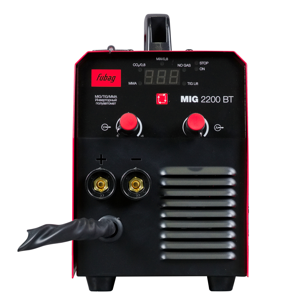 Купив сварочный инвертор Fubag MIG 2200 BT, вы получите аппарат с уже встроенной на заводе горелкой соответствующего аппарату ампеража длиной 2,4 м, трехметровый газовый шланг, а также кабель с электрододержателем (1,8 м) и кабель заземления (2 м). Передняя панель оснащена цифровым дисплеем, регуляторами силы тока и коррекции напряжения, что позволяет быстро и просто выбирать режимы и оптимальные параметры сварки. Эффективная система охлаждения, а также встроенная функция термозащиты гарантируют долговечность и надежность использования аппарата. Все технические характеристики наглядно и подробно указаны на корпусе аппарата.